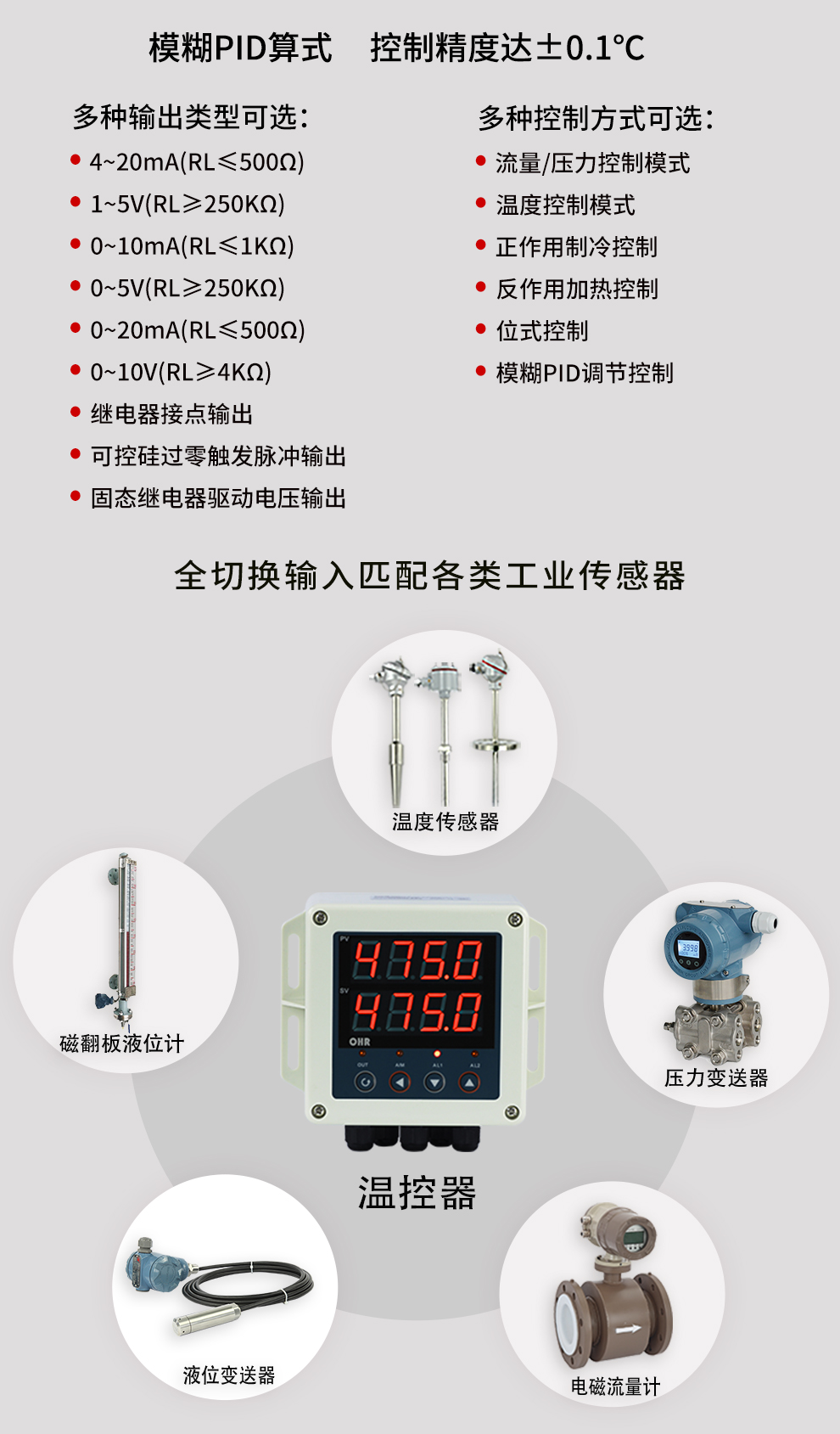 虹潤公司是專業生產溫控器的國家專精特新“小巨人”企業。生產的壁掛式PID溫控器,具有全切換信號輸入,真正人工智能算式,控制精度達士0.1°C,防護等級高,RS485通訊輸出DN等特點。產品獲得模糊PID控制儀及控制方法、人工智能調節器、智能化控制器、移相觸發控制器、閥門自動手動無擾動操作控制方法及裝置等5項國家發明專利,主持起草主持起草工業過程控制系統用模擬輸入兩位或多位輸出儀表、物聯網智能溫度儀表通用技術條件、工業過程測量和控制系統用智能調節器等3項國家標準,以及通信系統多通道數據采集控制終端規范軍用標準。參與國際5G標準制定,取得傻瓜式PID調節儀等3項相關軟件著作權。產品廣泛應用于電力、石化,冶金、制藥、食品等幾乎所有工業現場,實現精準控溫,保障生產安全與質量。